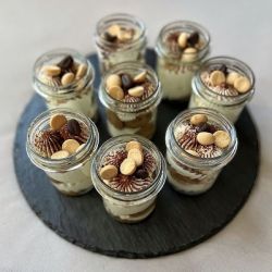 Panna cotta - jahoda alebo mango-maracuja(7) Panna cotta bezmliečna mandľová 3,00€ (8) Čoko mousse s jahodami (1,3,7) Tiramisu pohárik (1,3,7,8) Lotus caramel pohárik (1,3,7) - možnosť aj v bezmliečnej verzii DUBAI pohárik (1,3,7,8) 3,70€